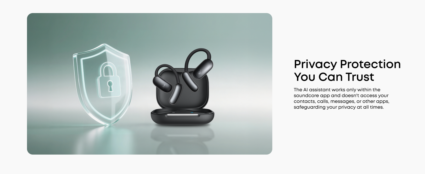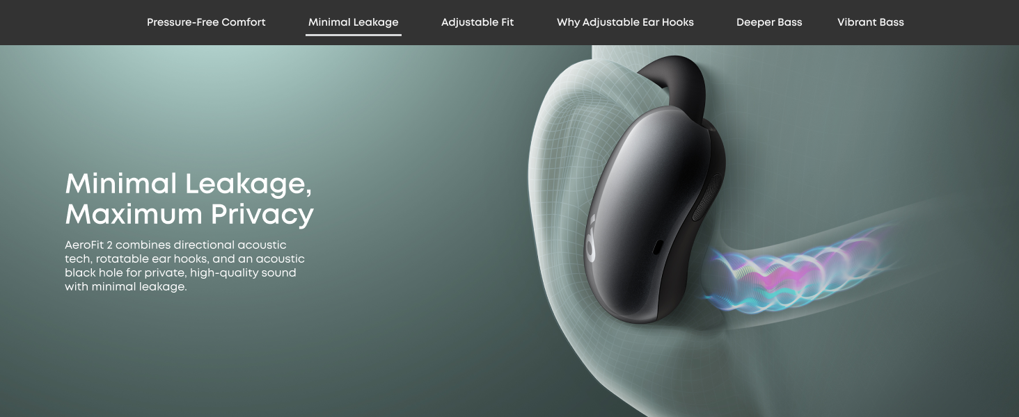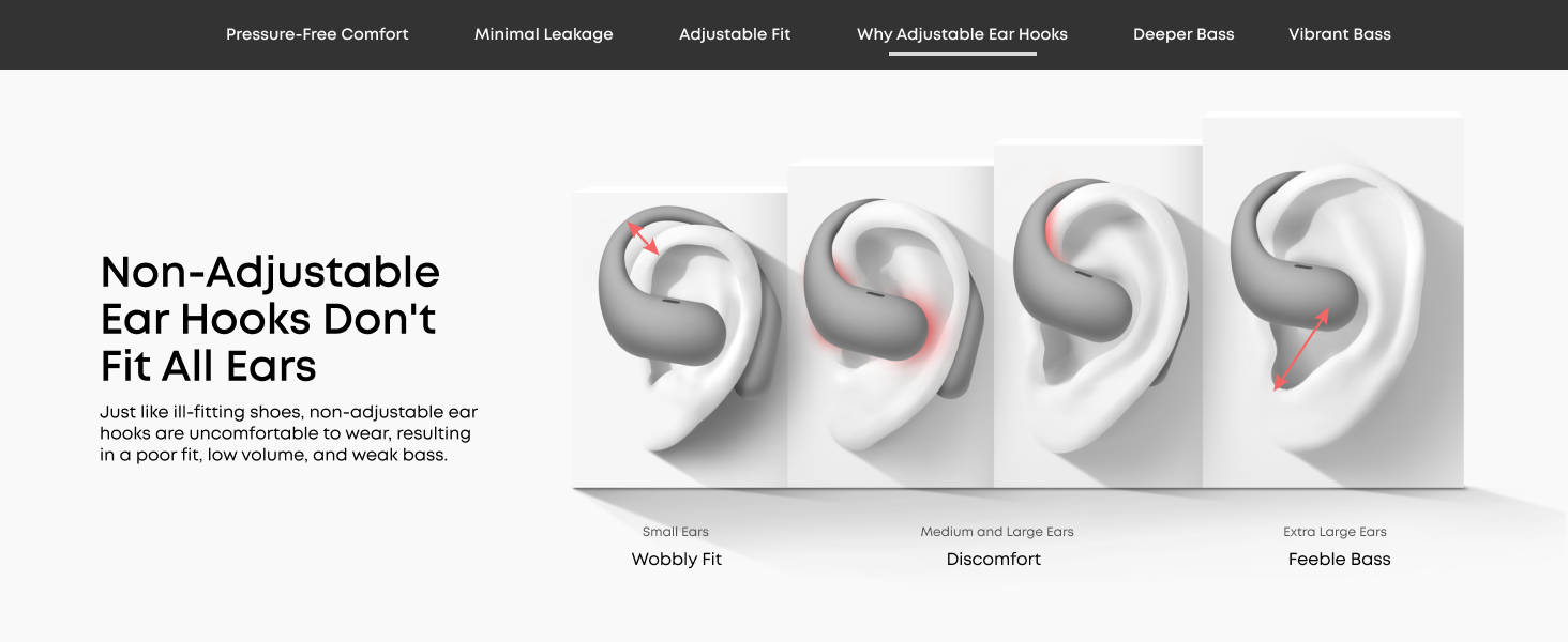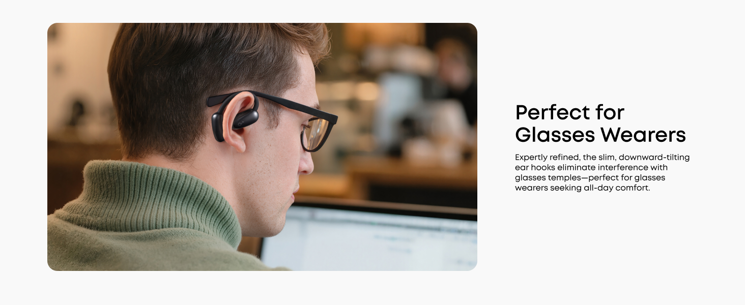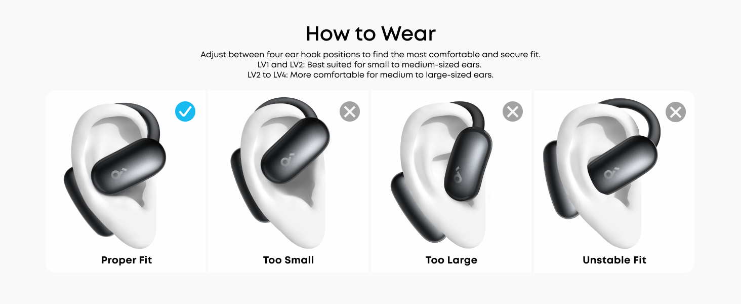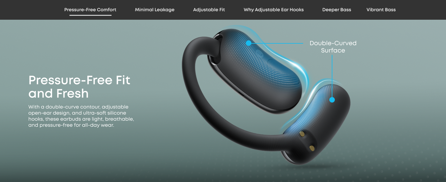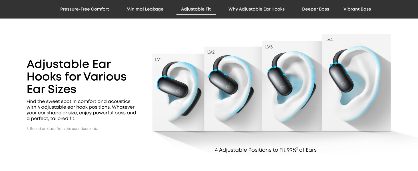 Pressure-Free Fit for Every Ear: Double-curved surface and soundcore's innovative 4-level adjustable ear hooks ensure a pressure-free fit tailored to over 99% of ear shapes and sizes.