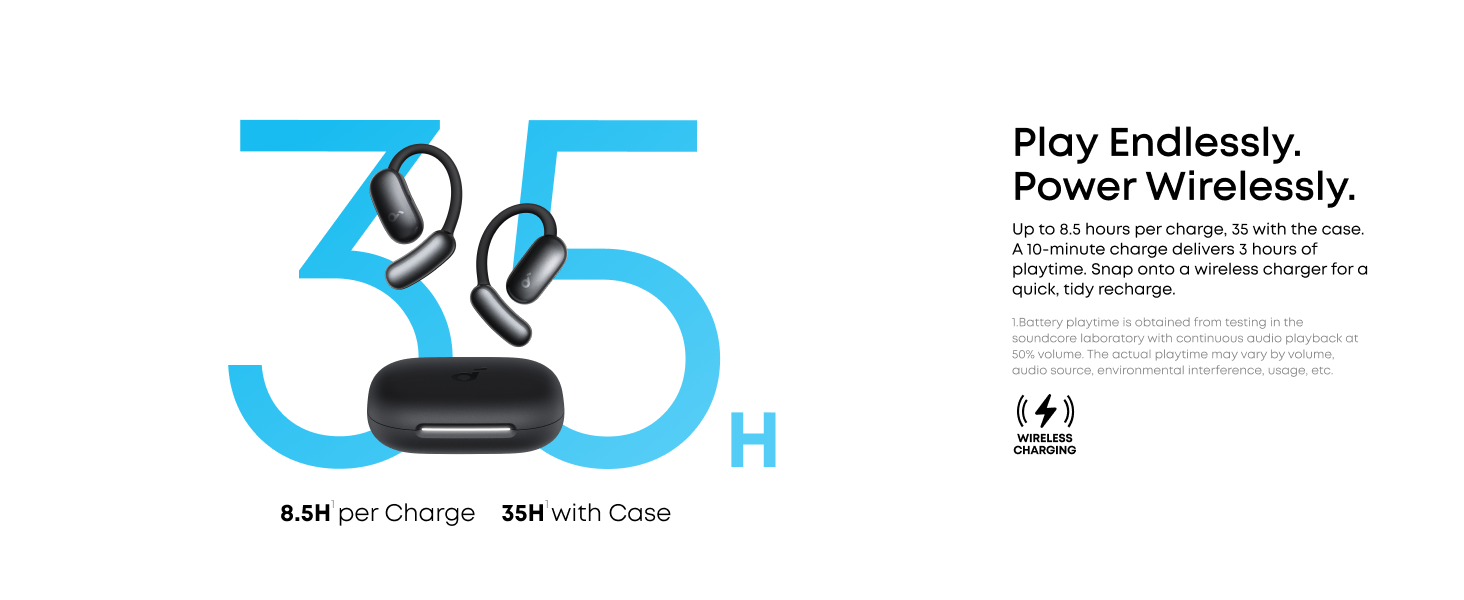 Wireless Recharge, Long Playtime: Place the case on a wireless charger for tangle-free recharging. Get up to 8.5 hours of music on a single charge, extendable to 35 hours with the case.