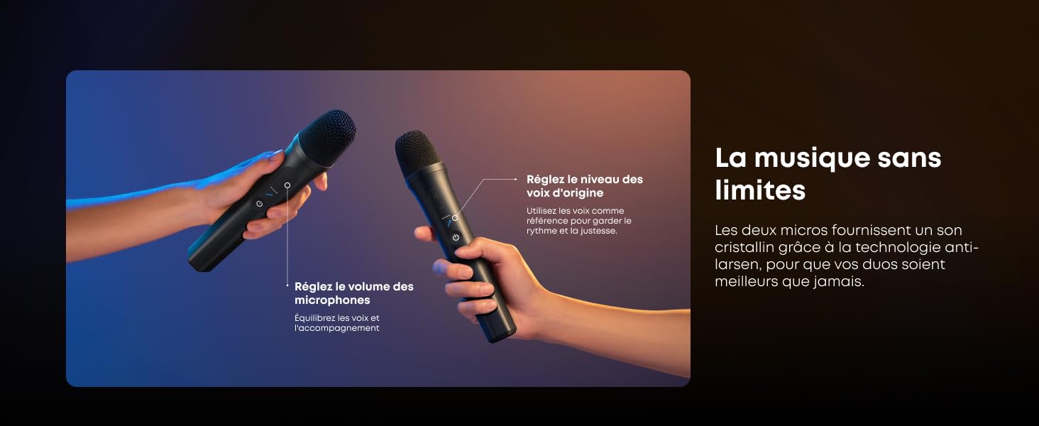 - Deux microphones sans fil : voix ultra-nettes, modulation du volume intégré et contrôle vocal à distance vous permettent d'interpréter tous vos duos comme si vous étiez sur scène.