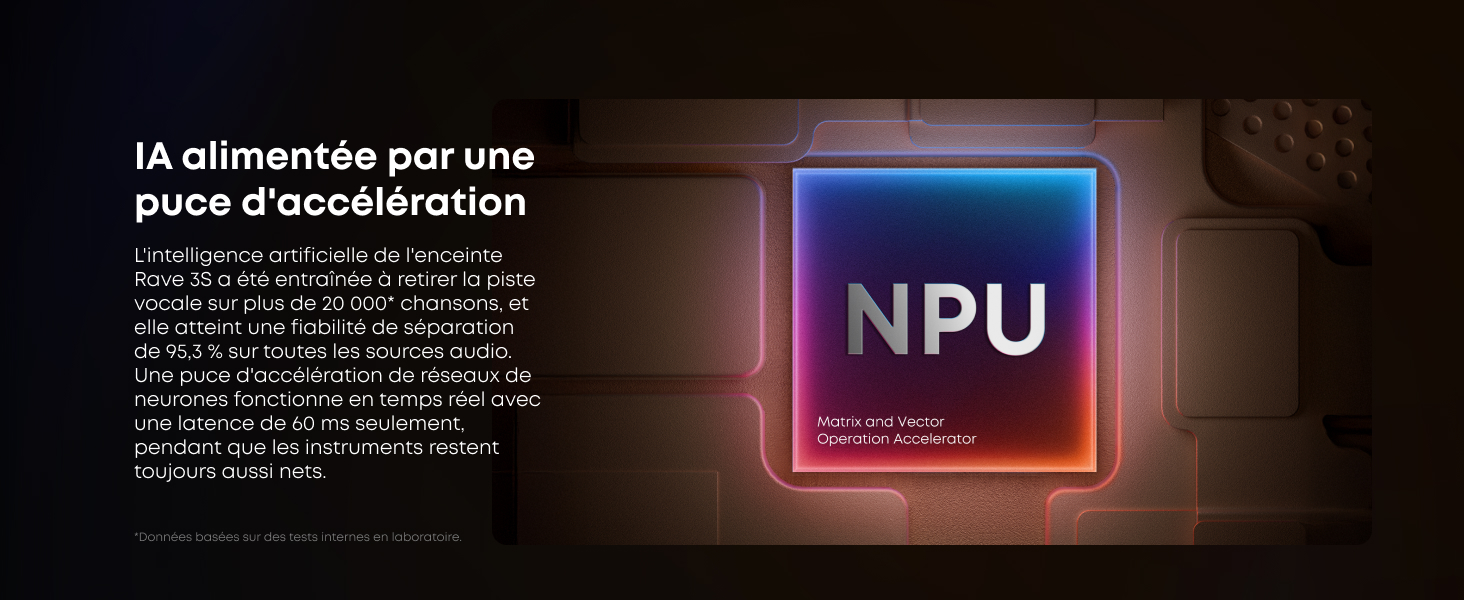 - Enceinte de fête avec IA intégrée : laissez-vous surprendre par notre nouvelle enceinte, qui vous fera profiter d'un son puissant et de jeux de lumière dynamiques. Avec deux microphones professionnels sans fil et la suppression de la voix par l'IA, chanter vos chansons préférées n'a jamais été aussi facile.