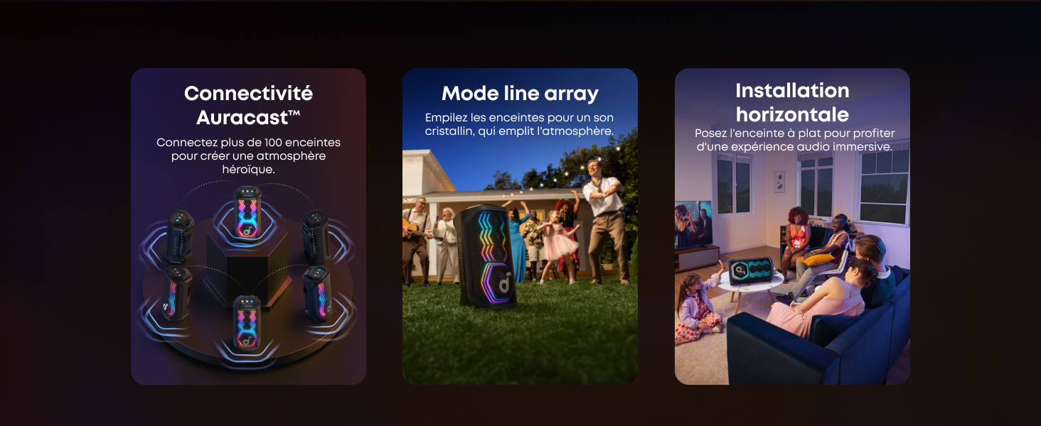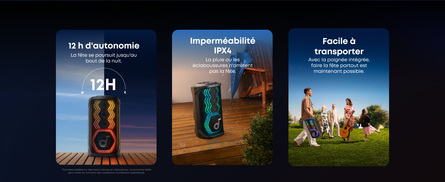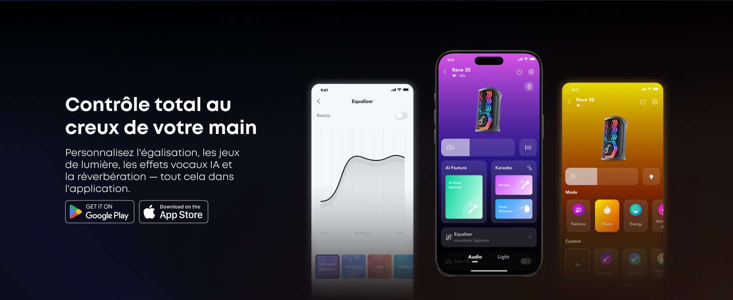 - Application personnalisée : grâce à l'application soundcore, contrôlez facilement votre enceinte de fête. Réglez facilement les paramètres de l'égaliseur, des lumières, des effets vocaux et de la réverbération.
