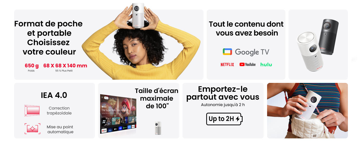 À emporter partout : ultra-compact et léger, ce projecteur tient dans la main et vous permet d’avoir accès à votre source de divertissement où que vous soyez.